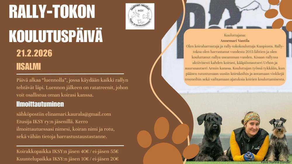 Treenivuoroja löytyy rally-tokolle, tokolle ja tottikselle! Ilmoittautuminen vuoroille alkaa edeltävänä lauantaina ja päättyy torstaina. Ilmoittautua voi sähköpostitse yhteyshenkilölle tai facebookissa kunkin treenin oman julkaisun alle.